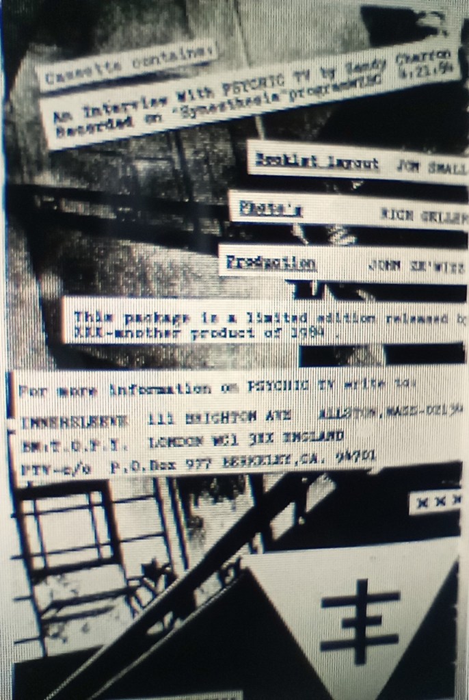 I released a cassette and booklet that Genesis agreed it waz a ‘Needed Release”. I designed the Concept layout with Jon Small transcribing the intent ov the performance called “TAPE REKONSTRUCTION” by Genesis. Me and SLEEPCHAMBER member RICHARD GELLER went to The PTV Press Conference that waz put on by San Chapel at Mass College ov Art. I had Richard take photos from the event that waz presented by GEN & JOHN GOSLING. Later used in the Inner-X-Release. I also published an issue ov THE OTHER SOUND mainly focused on Genesis along with photos ov all hiz personal erotick piercings. Their waz a draft ov the stage layout and where the TV monitors and large screen were positioned. Some T.O.P.Y -(Temple ov Psychic Youth)-philosophy also.