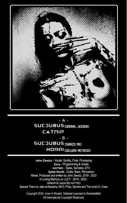- ……..SUCCUBUS -(Mix #1) ……..2) …..THE BADGE-(Working Title)…… 3)….ENCHANTMENT-(2023 Re-Mix) ……..4)….SUCCUBUS -(Snakes-Mix) … 5)…MEDUSA -(2023 Re-Mix w/Vocals)……. 6)…..CAN YOU FEEL MY BLOOD ? -(Vampyress Song /Zewizz Vocals-2023 Re-Mix)…… …7)…THE JEZABEL SPIRIT……8) …CATNIP ….After discussing the SUCCUBUS vinyl it waz agreed that a Full length LP az a Limited Edition would be the goal between SLEEPCHAMBER members and BACTERRIA FIELD RECORDS. Release to be SUMMER 2024.
