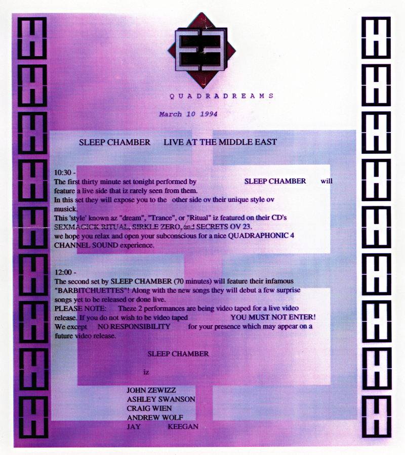 Well, funny I had just mentioned the space for each Post. We just reached it. So expect a Part #2 and possibly Part #3 to THE MIDDLE EAST Shows. I had a lot ov problems with THE MANRAY SHOWS at the end. Things would not upload because ov space. I could not even swap off photos. I waz just really getting started with this Post. I guess less photos maybe ? Anyway … More writing in THE MIDDLE EAST #2 about the Kaos and adventure playing such a great venue. Mostly BARBITCHUETTE stories. I will also list SLEEP CHAMBER Line-Ups, Set Lists, and the Quadraphonic stereo PA System we set up at THE MIDDLE EAST in 1994. We played a tribal/electronic set first, then a song set with THE BARBITCHUETTES. More info on Part #2. (stay tuned). I paid out ov my own pocket for this project. I paid for a 2nd Sound system. (PA). But it waz worth the concept. We used a 4-Track cassette master. Each Channel panned to a seperate dircetion. Front Left & right. Back left & right. SLEEP CHAMBER had worked with different EQ and frequencies to eastablish a unique sensory experience in our performances-Sound wize. Mostly sub-low bass frequencies and ultra-sonic high 450 levels ov high end. I waz searching for the unique frequency that would subconsciously reach true alpha-brain waves bringing the audience to a Trance-like attention.